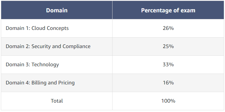 The final module gives an overview of the AWS Certified Cloud Practitioner exam, giving a breakdown of the domains as shown below.