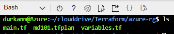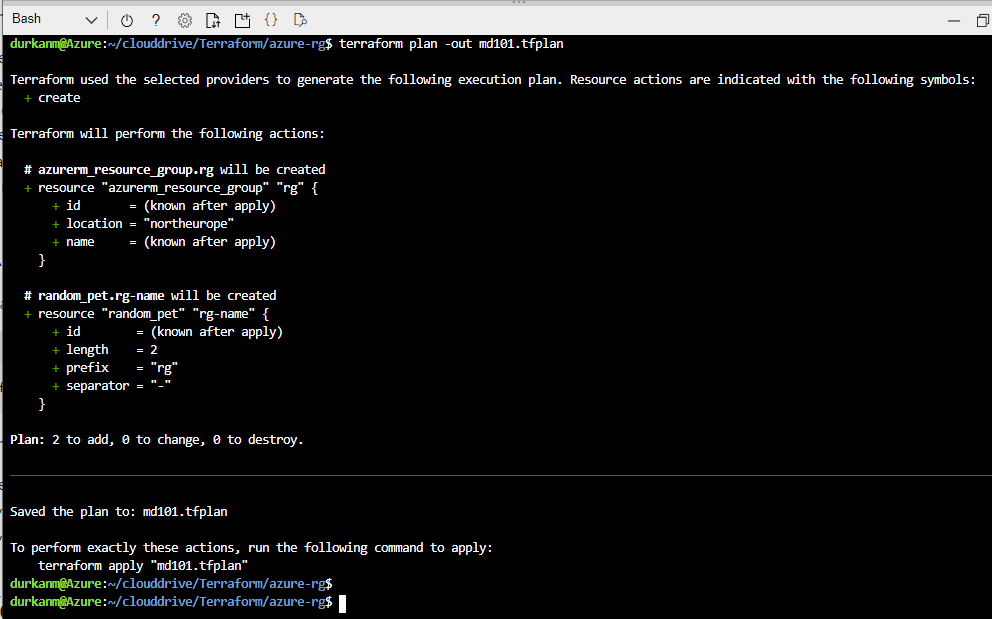 So now, we need to run terraform plan-out md101.tfplan – this creates and execution plan so we can see what is going to happen, but it doesn’t create anything. The -out parameter just outputs the plan to a file. This is useful if you are creating multiple plans and need to apply or destroy them at a later stage. We can see there are “2 to add, 0 to change, 0 to destroy”: