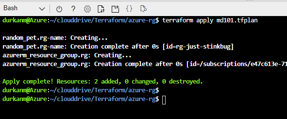 Now lets run terraform apply md101.tfplan to execute and create our Resource Group: