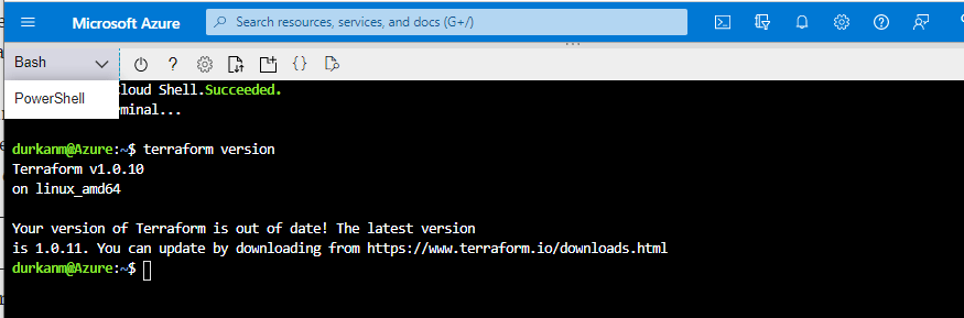 We need to browse to shell.azure.com from any browser and log on using our Azure credentials. This will open the Cloud Shell, adn we have the option to use either Bash or PowerShell. I’ve selected Bash for this session, and when I run terraform version it will give me the version of Terraform available to me in the shell.