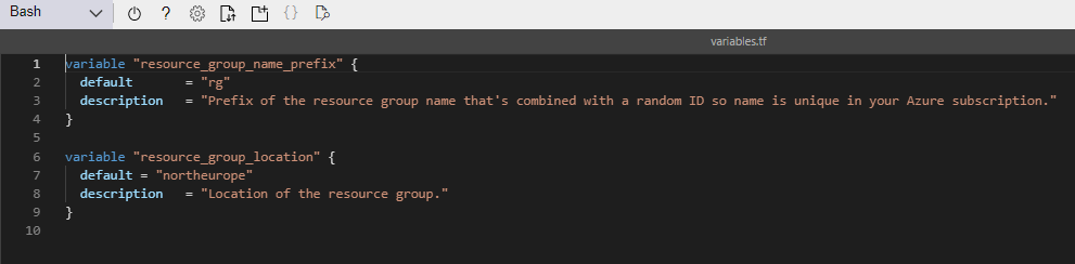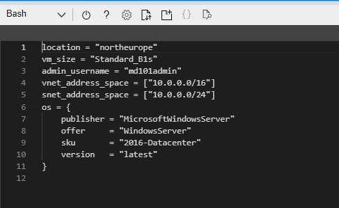 -varparameter on the command line to input the variables when runningterraform apply. So for example, we could runterraform apply -var="location=northeurope"to specify the location we want to deploy to. - terraform.tfvars file – this is a file that is deployed in the same location as the main.tf and variables.tf files and contains a set of key value pairs that are the variable and its value. An exmaple of this is shown below: