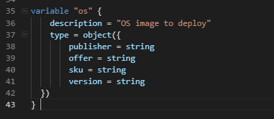 The next type of variable is a list, which is a sequence of values. In our example, this can be used to define the address space for vnets or subnets. Lists are always surrounded by square brackets.