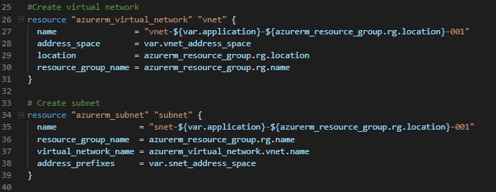 So now we have our variables defined in our terraform.tfvars file, we can now call them from our main.tf when running terraform apply. If you recall on Day 35, I used the var. syntax in the code to call the variables from variables.tf. If we look at the main.tf file now, we can see where this is now calling all of our variables, for example virtual network and subnet: