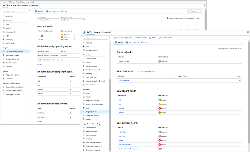 - VM Insights: VM Insights monitors your Azure virtual machines (VM) at scale. It analyzes the performance and health of your Windows and Linux VMs and identifies their different processes and interconnected dependencies on external processes.