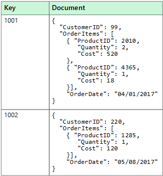A document data store manages a set of named string fields and object data values in an entity that’s referred to as a document. These are typically stored in JSON format, but can also be stored as XML, YAML, JSON, BSON, or even plain text. The fields within these documents are exposed to the storage management system, enabling an application to query and filter data by using the values in these fields. Typically, a document contains the entire data for an entity, and all documents are not required to have the same structure.