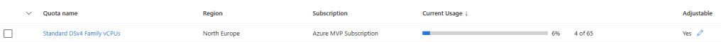 The translation point here is the concept of “quotas per subsciption” that has been mentioned already. The eagle-eyed among you will have noticed that the 65 vCPUs for my “Standard DSv4 Family vCPUs” are only relevant to the North Europe region. If we take the filter off North Europe and search for that SKU again: