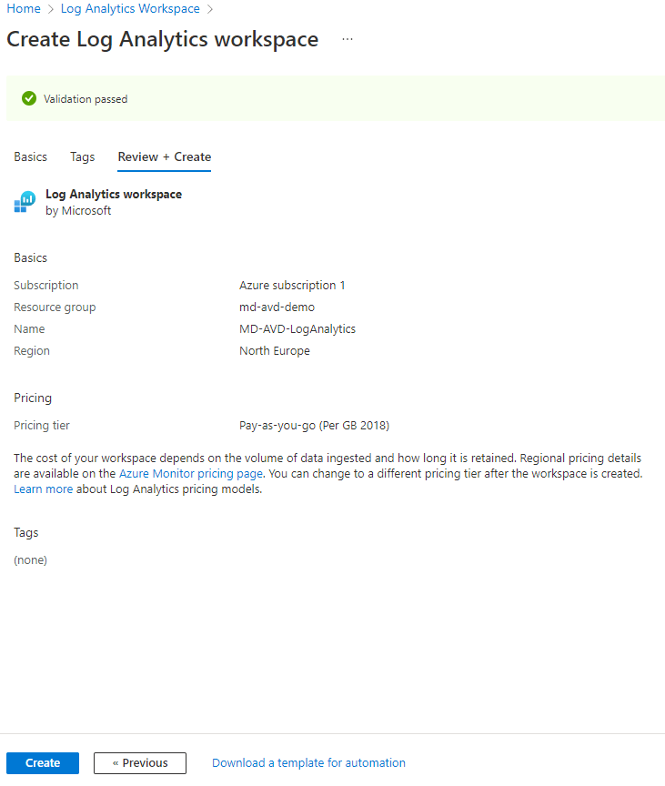 - And now we can validate our options and click on “Review and create”: