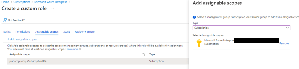 - Next, we have “Assignable Scopes”. You want to assign this at subscription level as assigning this custom role at any level lower than your subscription, such as the resource group, host pool, or VM, will prevent autoscale from working properly.