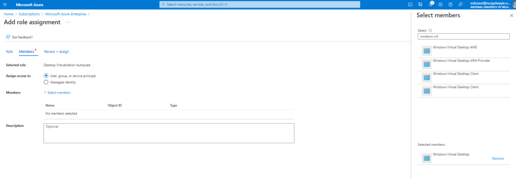 - We select our Custom RBAC role and in the members screen, we choose to assign access to a User, group or service principal. From the select members screen, search for “Windows Virtual Desktop”