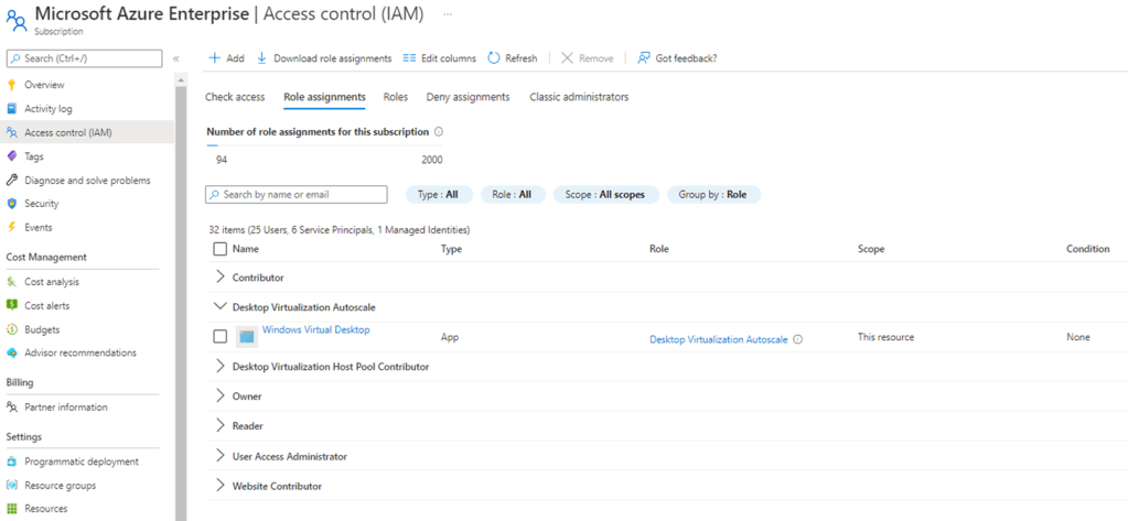 - Open the Azure portal and go to Subscriptions and select a subscription that contains a host pool and session host VMs you want to use with autoscale. Select Access control (IAM). Select the + Add button, then select Add custom role from the drop-down menu.
