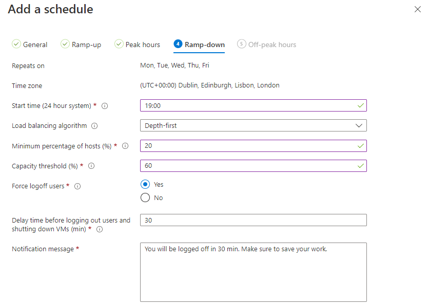 - Next up is Ramp-down, this is where we start deallocating hosts at the end of the working day and as you can see, the target is to get back down to 20% of the hosts. The important point to make here is the “Force logoff users” option. If this is enabled then the following applies: