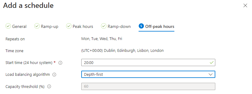 - Next up is Peak hours. For this we specify a starting time (which is normally when the majority of your users will be logging on) and we’ve also flipped the Load Balancing to “Depth-first”, which will load up all available hosts with user sessions (up to our 80% threshold) before bringing another one online. This is really up to you as to how you want to load balance, but as a reminder: