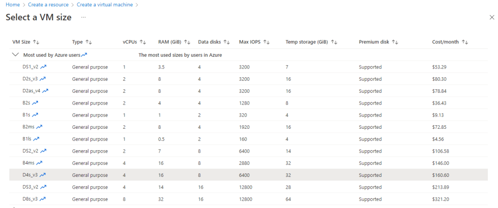 The base cost for this VM if you create a standard Azure Virtual machine comes in at approx $160 per month.