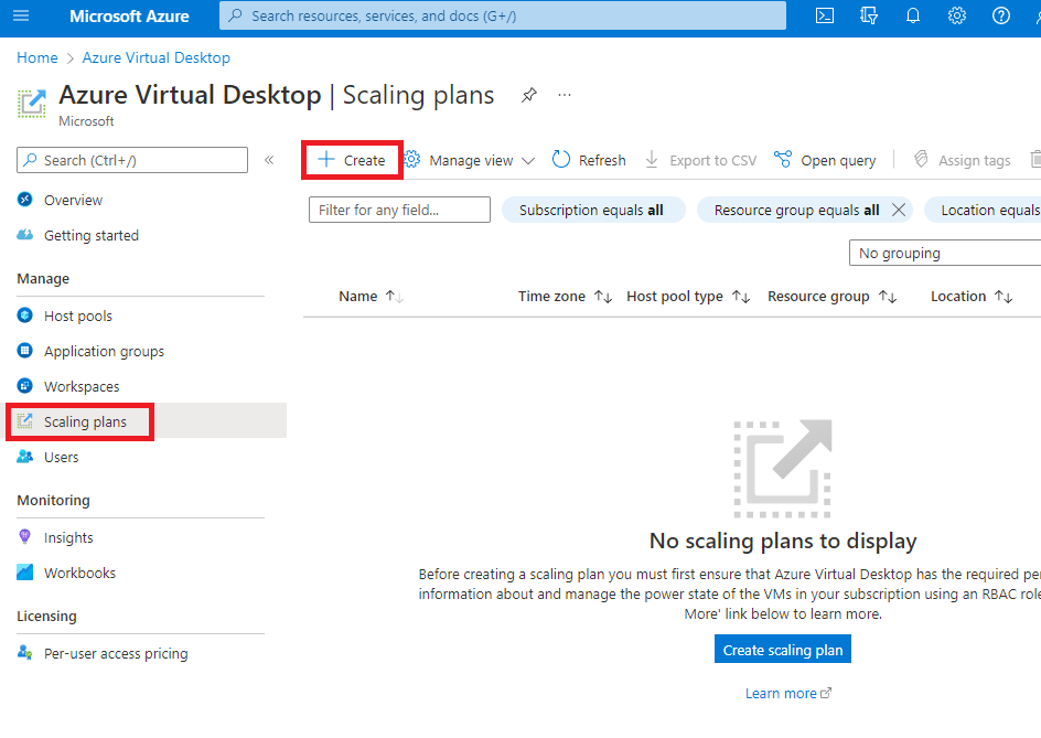 - Open the Azure portal. In the search bar, type Azure Virtual Desktop and select the matching service entry. Select Scaling Plans, then select Create.