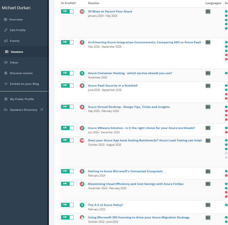 My Sessionize profile has quite a lot of red in it:
