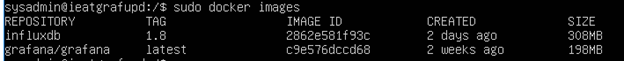 We’re running InfluxDB on port 8086 as this is its default. So now, lets check our 2 containers are running by running sudo docker ps: