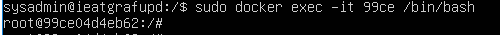 OK great, so we have our 2 containers running. Now, we need to interact with the InfluxDB Container to create our database. So we run sudo docker exec -it 99ce /bin/bash: