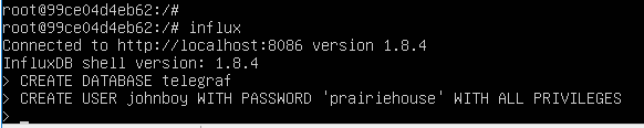 This gives us an interactive session (docker exec -it) with the container (we’ve used the container ID “99ce” from above to identify it) so we can configure it. Finally, we’ve asked for a bash session (/bin/bash) to run commands from. So now, lets create our database and set authentication. We run “influx” and setup our database and user authentication: