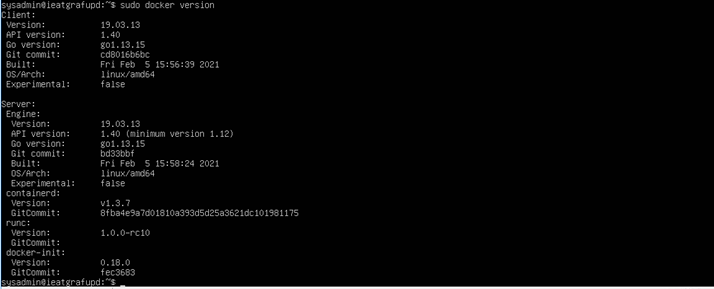 The updates will complete, and this will also install Docker as we had requested during the initial setup. Lets check to make sure its there by running “sudo docker version”: