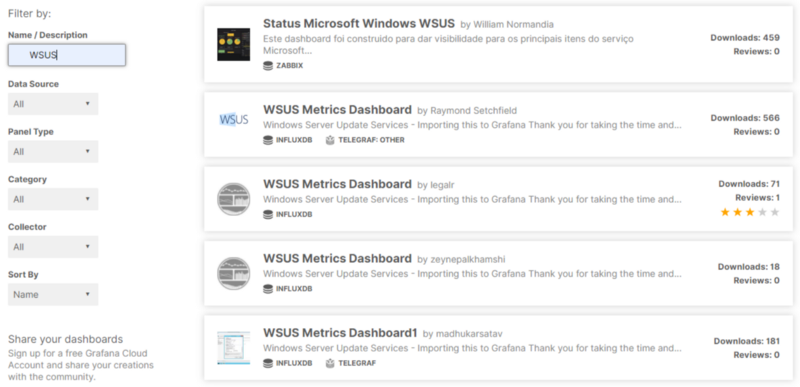 Now that we have Grafana running, we need a Data Source to store the data that we are going to present via our Dashboard. There are many excellent data sources available, the question is which one to use. That can be answered by going to the Grafana Dashboards page, where you will find thousands of Official and Community built dashboards. By searching for the Dashboard you want to create, you’ll quickly see the compatible Data Source for your desired dashboard. So if you recall, we are trying to visualize WSUS Metrics, and if we search for WSUS, we find this:
