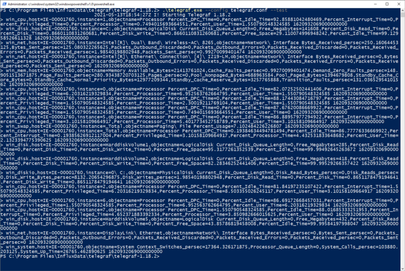 Now once we save the changes, we can test our telegraf.conf file again to see if it returns the data from the PowerShell script as well as the default Windows metrics. Again, we run:
