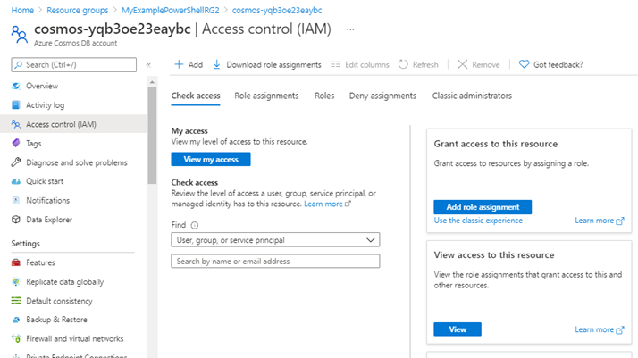 So now we have our identity, we need somewhere to assign it to. For the purposes of this Demo, I’ve created an Azure Cosmos DB. So in the Cosmos DB instance, I go to the “Access Control (IAM)” menu option, and click on “Add Role Assignment”: