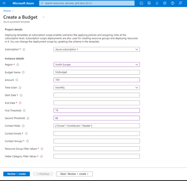 With Azure Budgets, you can easily define the budgets in line with your predicted cloud spend based on amount, time period, and reset schedule to keep everything aligned.