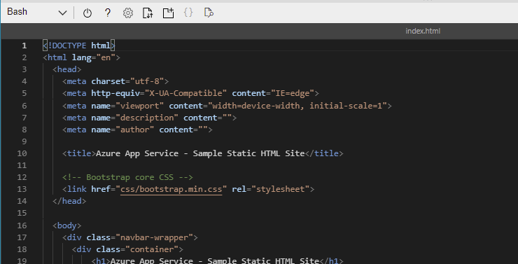 We can see that the sample website is available. So now lets change the heading – from our bash shell we’ll run code index.html to open the editor.