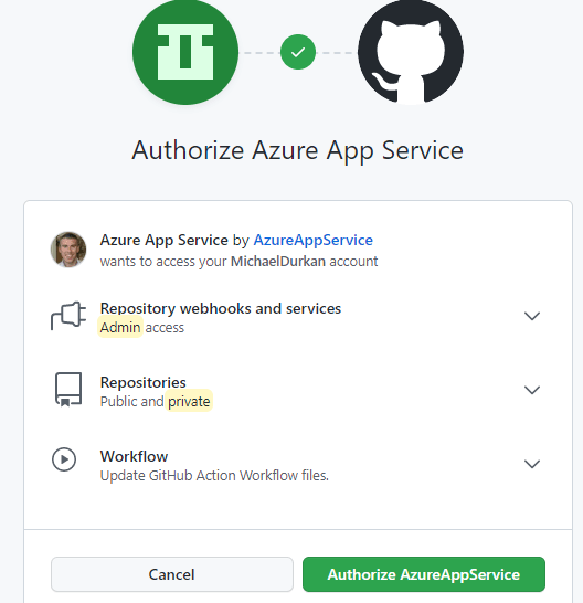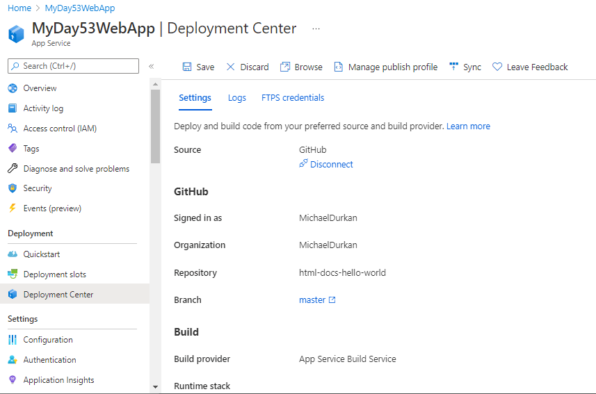 Once we’re loged into Github, we can select the Repository and Branch that we wish to use in our deployment. One thing that I changed here was the Build Provider – where we see “Building with GitHub Actions”, I changed this to “App Service Build Service”