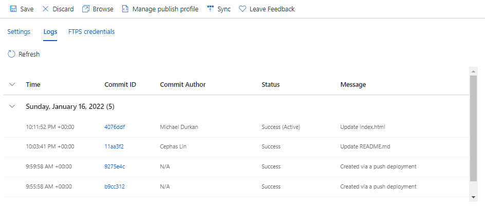 So we’ll do a commit of the changes in GitHub. And if we check our logs again, we can see another deployment has happened: