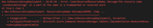 OK, so lets deploy. Instead of using “New-AzVM” as I did in the PowerShell post, I need to use “New-AzResourceGroupDeployment” command instead as I’m deploying directly to an existing ResourceGroup: