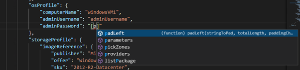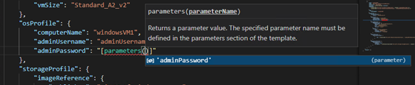 I’m going to delete the “adminPassword” description and call my parameter. To do this, I create square brackets [] and enter the letter “p”. As I can see, this gives me options to pick from and “parameters” is one of them: