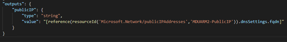Secondly, for the resource identifier, I needed to output a string value as this is what the output was expecting. So I needed to add “.dnsSettings.fqdn” to then end of the resourceId.