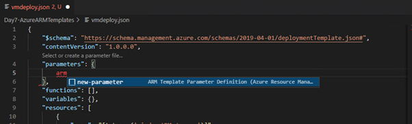 One final thing I’m going to do is create a parameter for the Admin Password for the VM so that it prompts us during deployment to enter it. So back at the top of the template in the “parameters” section, I’ll do a return and type “arm”: