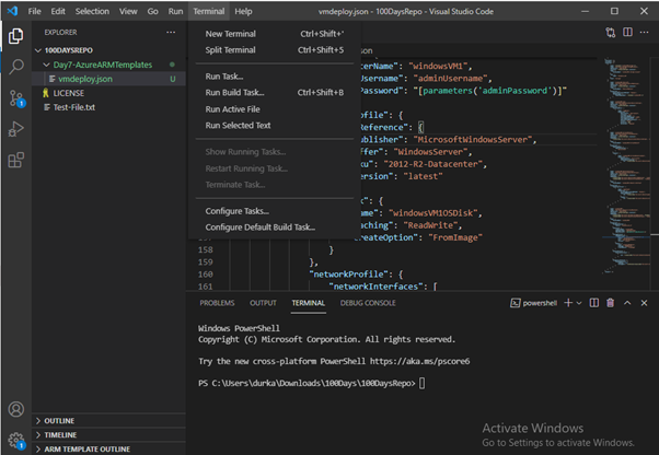 And that’s it! I can save this and go to PowerShell to deploy. Or I can do this from within Visual Studio Code by click the “Terminal” menu and selecting “New Terminal”. This will open a PowerShell Terminal at the bottom of the screen, and it defaults to the folder location of our Repository: