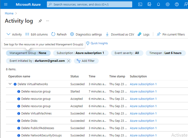This takes a few minutes (so don’t worry if the PowerShell prompt just sits there. Don’t forget, deleting the resource group deletes all of the Resources it contains. After a few minutes, I’ll check the Activity Log in the Portal and it confirms that the RG and all resources have been deleted: