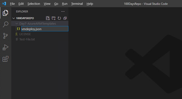 I open Visual Studio Code on my machine, and as you can see I’m in my 100DaysRepo that I created and merged from GitHub. I’m going to create a new folder by clicking the “New Folder” button, and call it “Day7-AzureARMTemplates”: