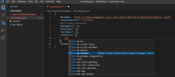 This is a standard JSON template that contains the options that I described above. But nothing about Azure yet though, so how can I deploy a Virtual Machine (or anything for that matter). In the “Resources” section, I’ll do a “CRLF” or “Return” to create a new line, and type in the word “arm again”: