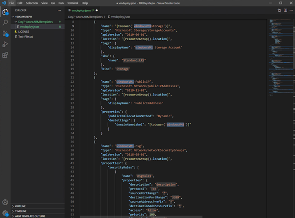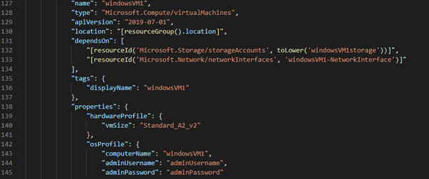 The other thing I’m seeing is that the word “windowsVM1” is highlighted across the entire JSON. That’s because this is the default. And if I wanted to, I could deploy this as is into my Azure Subscription and it would do exactly the same as the short “New-AzVM” command did — it will create any resources that do not already exist using this naming convention. I’ll leave this in place for the purposes of the Demo, but would advise you to change this using your own company or personal naming convention prior to deployment.